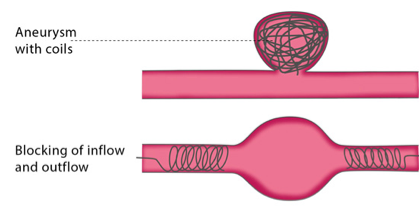 Coils or other materials that cause the blood to clot can be placed in the aneurysm (+/- the adjacent normal artery). This prevents blood flow through the aneurysm and is an effective treatment. The coils are usually delivered through a catheter.