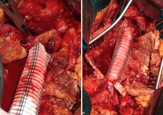 Clamps are applied above and below the aneurysm while suturing takes place.